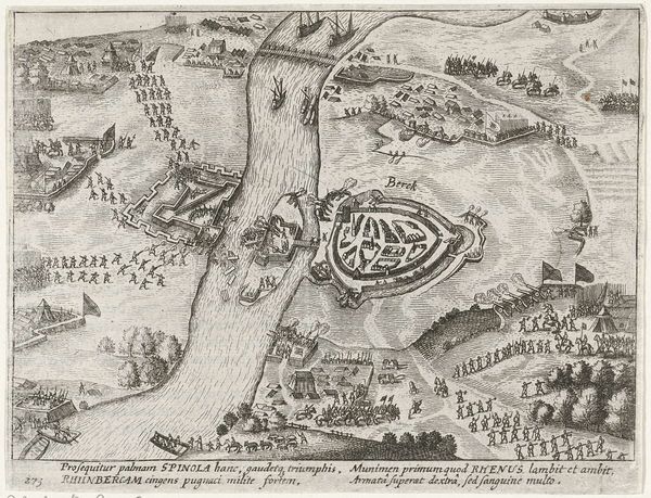 This anonymous engraving depicts the siege of Geertruidenberg in 1593, capturing a pivotal moment in Dutch military history. The orderly arrangement of troops and ships, combined with the town's fortifications, symbolizes the strategic calculations and power dynamics of siege warfare during this period. The star-shaped fortresses, an innovation of the Renaissance, represent more than just military architecture; they embody a shift in thinking about defense. These forms echo in the layout of Italian cities, revealing how human intellect attempts to impose order on chaos, both on the battlefield and in urban planning. This geometrical symbol can be traced back to ancient diagrams, representing the cosmos, reappearing in various contexts as humanity seeks to dominate its environment. The image evokes the tension between the desire for security and the inevitability of conflict, revealing a recurring theme in human history. This engraving thus becomes a powerful reminder of the cyclical nature of war and innovation. It embodies our collective memory, reminding us of the psychological impact of sieges and the human capacity for both destruction and ingenuity.