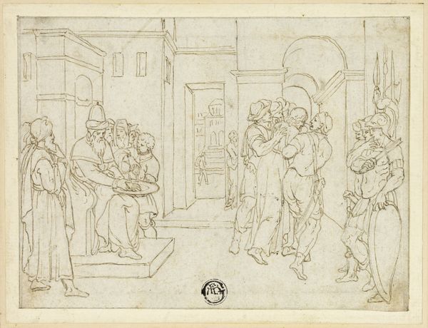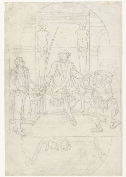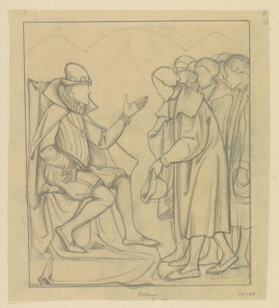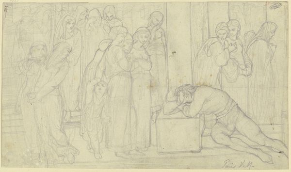Ditlev Blunck created this drawing, 'Three Musicians and a Young Listener,' using graphite. The composition is structured around a play of vertical and horizontal lines. The musicians stand tall, their figures elongated and defined by the vertical strokes of the graphite, while the steps and wall behind them provide a stark horizontal counterpoint. The artist uses line weight strategically to create depth and shadow. The heavier lines bring the musicians forward. The shading suggests a light source from above, casting shadows that anchor the figures in space. There's a sense of anticipation in the group’s arrangement, a moment of pause before the music begins. Blunck seems interested in exploring how the geometry of the built environment intersects with the organic forms of the human body. This contrast invites us to consider the relationship between the stability of structure and the dynamism of human expression. The musicians are poised to disrupt the silence, to fill the geometric void with sound.