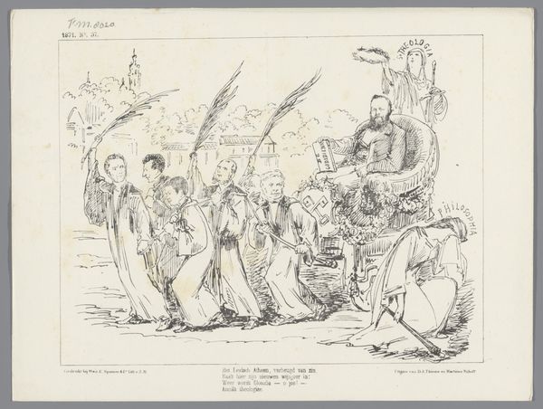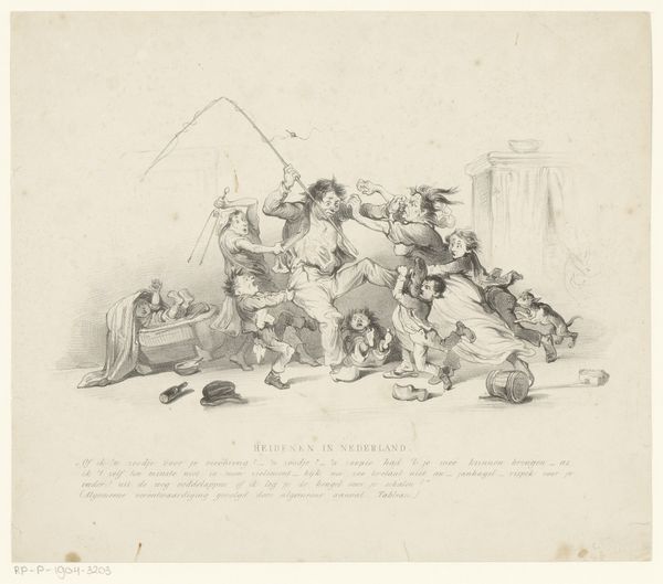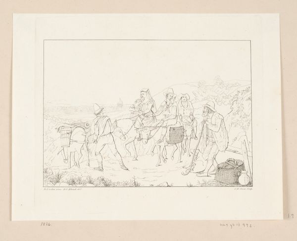 Editor: This drawing, “Sprookjesfiguren bekijken een ijsbeer,” or "Fairy Tale Figures Watching a Polar Bear," is by Adrie Vürtheim, created sometime between 1917 and 1970. It seems to be made with pen and ink. The image feels very whimsical and story-driven. How do you interpret this work? Curator: Well, looking at this from a materialist perspective, it’s fascinating to consider the context of its production. Vürtheim uses simple, readily available materials: pen, ink, and paper. It appears to be a sketch, a quick study. The accessibility of these materials hints at a democratic approach to artmaking, making art outside traditional academic art. How might this challenge our notion of art as being confined to specific, privileged spaces? Editor: That's interesting. I never thought of the materials in terms of accessibility. So, you’re saying the simplicity of the materials challenges traditional hierarchies? Curator: Exactly. This drawing's creation bypasses the need for expensive studios or tools. It speaks to a tradition of folk art where the value is not in the cost, but in the accessibility and story telling. Who are the expected consumers or owners of such art? Editor: Perhaps people who value storytelling and imagination over expensive materials? The image has this childlike feel; I'm drawn to its informal nature. It invites closer inspection, the materials becoming less important than the depicted scene. Curator: Precisely! The very act of sketching, using simple lines and readily available material, points to the labour invested. This shifts focus from finished product to process and invites inquiry. Ultimately, the work reveals and celebrates this history of making, pushing boundaries of high art and craft. What do you take away from understanding the piece in that context? Editor: It makes me reconsider how materials themselves can be a statement about who art is for and how it is made.