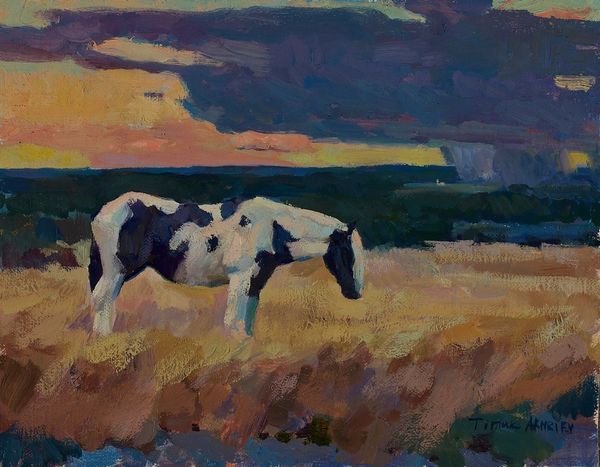 Vasily Vereshchagin painted "Himalayan Ponies," capturing a scene that reflects his experiences as a Russian artist traveling through Central Asia in the late 19th century. Vereshchagin was known for his unflinching depictions of war and his interest in the cultural life of the regions he visited. In this work, the ponies are not merely animals in a landscape but stand as symbols of labor, endurance, and the intertwined fates of humans and animals in this harsh environment. The decorative saddle, and the simple bridle suggest a co-dependence, hinting at the relationship between man and animal. Consider how the ponies, though central to the lives of the people, are relegated to the background of history, much like the experiences of many marginalized communities. Vereshchagin’s empathetic portrayal invites us to reflect on our connections with the natural world. The painting, with its quiet, somber tones, evokes a sense of respect for the animals that share in the burdens of human life.