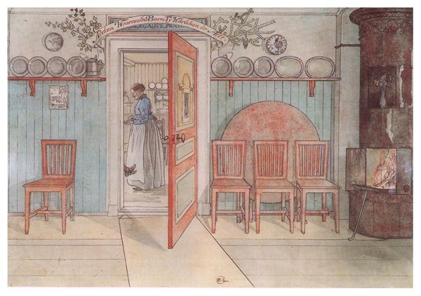 Editor: This watercolor, called "The Studio," was created in 1895 by Carl Larsson. I’m struck by how domestic and lived-in the space feels, yet also seems meticulously arranged. What catches your eye when you look at this piece? Curator: I am drawn to the symbols woven into this apparently simple domestic scene. Consider the woman seated—likely the artist's wife—she embodies a sense of quiet contemplation, a figure almost iconic in her domestic role. Does she suggest the muse, or something else? Editor: I see her as a muse. She’s positioned looking at what appears to be another painting. Is Larsson referencing artistic creation? Curator: Exactly! The artist sets up multiple layers of looking and picturing: he’s painting, she’s observing what may be his painting, and we are observing them both. Look closely at the details – the wooden monkey atop the cupboard, the Delftware on display. These objects root this idyllic setting in the Arts and Crafts movement ideals, evoking a longing for simpler times. What emotional significance do these items have in your opinion? Editor: They represent a celebration of craftsmanship and a rejection of industrialization. I also notice a child peeking from the door in the background, adding a layer of playful disruption to an otherwise staged interior. Curator: A sharp observation! The child is more than mere decoration; children are emblems of the future. In what ways might this composition comment on the cyclical nature of art and life? Editor: I think it’s about tradition and continuity: art inspires life, life inspires art, and the next generation enters to continue the cycle. This image, then, captures a particular moment while referencing the perpetual human experience of creativity. Curator: A beautiful synthesis. Reflecting on "The Studio," it seems Carl Larsson crafted a microcosm of artistic vision, cultural memory, and domestic tranquility, making it an artwork which continues to charm generations. Editor: Yes, it truly has so many layers. It feels very personal but relatable to others too. Thanks for unpacking it with me!