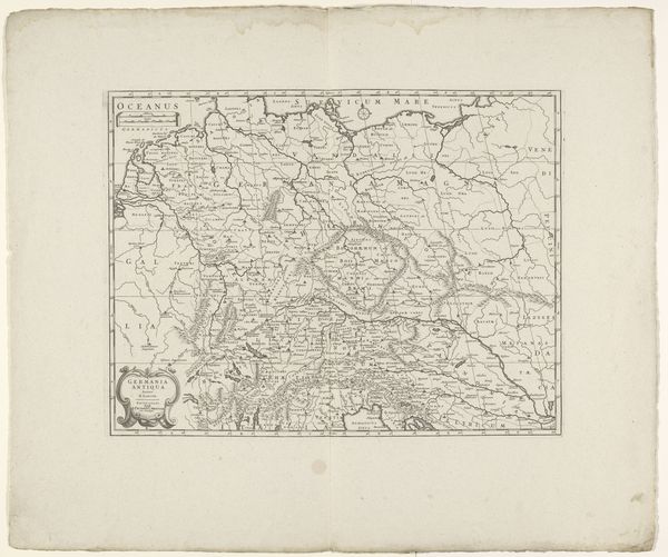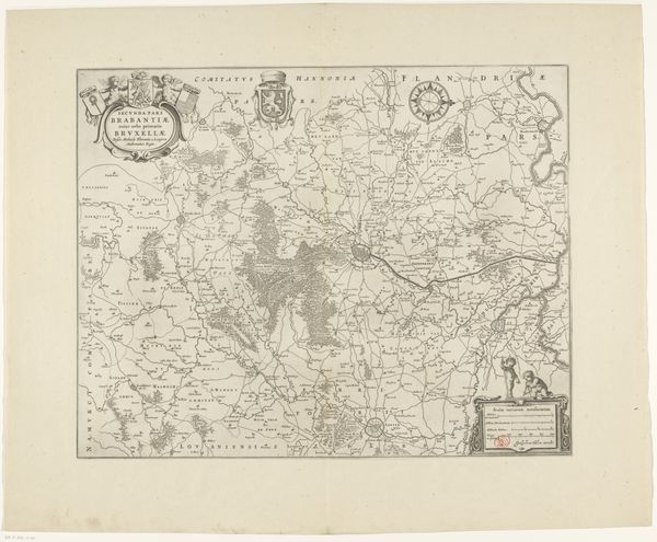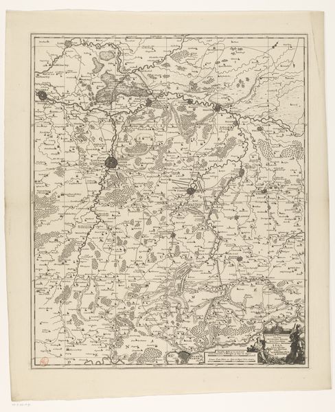 Curator: Here we have an early 18th-century engraving from an anonymous artist, titled "Kaart van het graafschap Henegouwen," which translates to "Map of the County of Hainaut." It's part of the Rijksmuseum's collection. Editor: It immediately strikes me as an object of power and control. There's such precision in mapping territory, it feels like an assertion of dominance, even with its aged and delicate lines. Curator: Maps, you see, were potent symbols then. More than geographical guides, they were visual embodiments of order and authority. Take note of the allegorical figures adorning the margins. Notice how they are rendered with specific detail in the baroque style, giving us a glimpse into the cultural values they reflected? Editor: The Baroque elements do soften the potentially harsh implications of territorial surveying, don’t they? It's like the cartographer wanted to suggest this wasn't just about lines on a page but about people, prosperity, perhaps even divine favor. I think its connection with modern geopolitical theory and ongoing conflicts should be acknowledged. How does what is included or excluded, emphasized, or de-emphasized play into claims and disputes about this very territory today? Curator: True, the map depicts Hainaut, now divided between Belgium and France. Consider how the act of mapping defines—and perhaps even confines—identity within these borders. Boundaries not only divide spaces, but people, histories, and cultures as well. The way villages, forests, and rivers are detailed… they all contribute to a particular vision. The symbols tell us which cities or territories are aligned in their fealty to particular leaders. The symbolic representation really carries cultural weight. Editor: And who decides what those symbols *mean*? Power dynamics are not simply portrayed, but perpetuated through such depictions. What perspectives are silenced or minimized here, I wonder? And how does its very existence today—displayed in the museum—serve to normalize these historical divisions or prompt us to critically question them? This conversation certainly reinforces how a map, on its surface objective, is undeniably infused with politics and identity. Curator: It seems we’ve charted a course into the deeper meanings held within this seemingly simple map. Understanding the cultural language and impact these historical engravings held can shed much light on both our present, and how visual culture shapes history, wouldn't you say? Editor: Absolutely, examining maps critically pushes us to reconsider the power structures embedded in even the most unassuming historical artifacts.