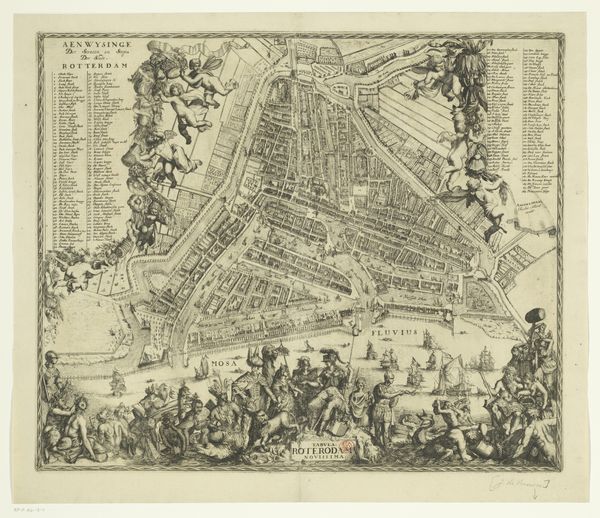 Editor: This print, "Gezichten op Paleis Het Loo, de bijbehorende gebouwen en het bijbehorende park," possibly made between 1690 and 1737 by Romeyn de Hooghe, presents a detailed panorama of the palace and its gardens. What strikes me is how meticulously planned everything appears. What do you see in this work? Curator: The organization of space is key. Think about what a royal garden symbolizes. It's about power, control, and the imposition of order onto the natural world. This image, functioning almost like a blueprint, served to project and reinforce that image. Consider how the surrounding smaller scenes amplify this, capturing life lived according to protocol. Editor: That’s fascinating, a blueprint for power! So the very act of depicting the gardens in this way, with such precision, becomes part of the message? Curator: Precisely. And what is history-painting without an exact image of the stage it played out upon? Reflect on the deliberate placement of figures within the garden – their choreography suggesting rituals, hierarchies, and a clear visual language that the intended audience would have instantly grasped. Even the smallest figure contributes to the broader iconography. Editor: It's incredible how much is communicated through the spatial arrangements and the symbolic value that projects outwardly, like ripples in water. Curator: Think of these meticulously placed statues: classical figures often used to convey specific virtues, or allegories that tie the present ruler to a lineage of great leaders. Even the specific flowers planted might have carried coded meanings lost to us now, but obvious to a 17th-century audience. What lasting effect might images like this have? Editor: I never would have considered that flowers or statues held coded meaning. So images of that time became lasting memories as well. Curator: The artist is creating not just a representation but a memory, solidifying a particular narrative for generations to come. It truly shows how an image extends through cultural memory.