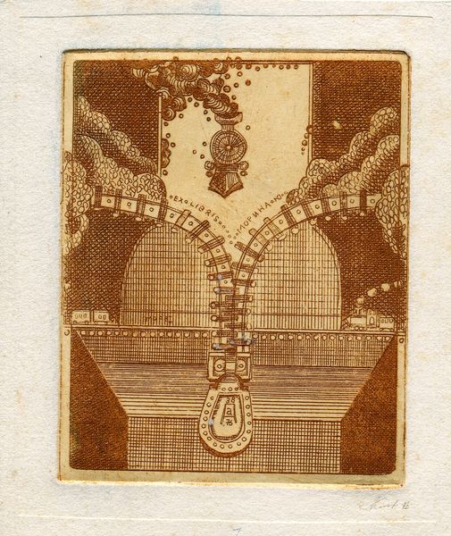 Editor: This is Oleksandr Aksinin's "Exlibris of B.Pikulitsky" from 1976. It's a small print, a bookplate really, with a geometric design and some very delicate engraving. It feels almost like a secret code, or a personal emblem. What do you see in this piece? Curator: It is indeed an intriguing emblem. Aksinin's work often operates within a dense symbolic field, doesn’t it? Look at how he combines geometric forms with more organic, almost whimsical elements. The overall impression is one of contained energy. Editor: Yes, exactly! It’s both ordered and chaotic at the same time. The "Ex Libris" aspect suggests ownership, a mark of personal identity… Curator: Precisely. But consider also how Aksinin utilizes established symbolic languages while forging his own. The geometric framework might represent structure, intellect, the cosmos. Then we have softer forms evocative of nature. Notice how these interact. Is he hinting at a harmonious relationship between intellect and nature, perhaps? Editor: That’s fascinating. So, the geometric and organic elements aren't just decorative, they carry a deeper meaning? Curator: Absolutely. These images trigger emotional and cultural memories, connecting to both personal history – Pikulitsky's library, his identity – and broader cultural myths. Even the very act of creating a miniature, a secret visual world, echoes the rich history of heraldry and personal symbolism. What do you make of the vessel at the top? Editor: I hadn't considered it deeply but now it evokes notions of alchemy, or perhaps even spiritual cleansing. A quest for knowledge or transformation? Curator: A journey into the unknown depths, reflected within this miniature universe. What’s intriguing to me is how this seemingly simple print manages to compress so many layers of meaning. Editor: I agree. I initially saw it as a decorative piece, but now I recognize it as a powerful statement about identity, knowledge, and the connection between the personal and the universal. Thank you!