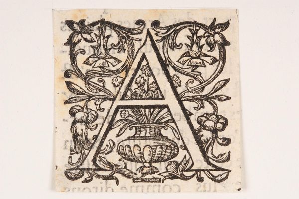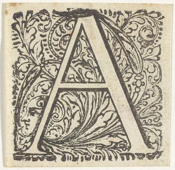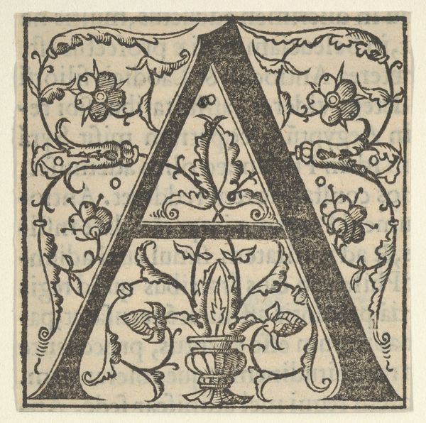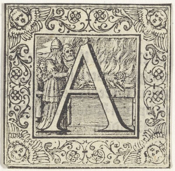 Editor: This is an initial letter ‘A’ with putto, a woodcut print made around 1496 by an anonymous artist. It's fascinating how such detail is achieved with such a simple material! How can we interpret the meaning and context of this piece? Curator: The emphasis here, I think, is the materiality and means of production. This isn’t high art, in the traditional sense, but a mass-produced woodcut intended for wider consumption, perhaps as part of a book. Think about the labour involved in carving those intricate floral details into a woodblock, and the volume of prints that could then be made. What does the choice of a relatively inexpensive material like wood suggest about the intended audience? Editor: It sounds like the intent was to democratize art, making it accessible through print. Was woodcut a common method then? Curator: Precisely! Woodcut was crucial for disseminating images and text quickly and affordably. Look at the stark black and white contrasts – this wasn't about nuanced shading like painting, but about efficiency in production. Even the inclusion of a putto – a common motif in Renaissance art - becomes interesting when seen as a replicable, and therefore marketable, image. What kind of social function does it serve if anyone can have access to art? Editor: That’s a great point, it’s not just the image itself, but the impact of reproducible art on society at the time. It makes you consider how we consume art even now. Curator: Exactly. By focusing on the material conditions and the means of its distribution, we understand not just the image, but its role in the burgeoning print culture of the late 15th century. Hopefully you will never view material choices in art the same way again! Editor: This really changes how I see art from this period. Thanks for shedding some light on that!
