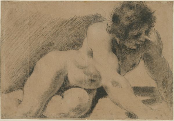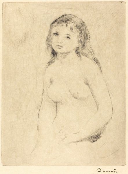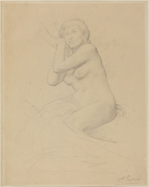This is an undated drawing, with graphite, of a woman, made by an anonymous artist. The anonymity surrounding the work invites us to consider the historical context that might have obscured the artist's identity. In the portrayal of the woman, we can see how beauty standards, gender roles, and the male gaze have shaped representation. The woman’s downward gaze and the vulnerable exposure of her upper body reflect a visual language that often positions women as objects of contemplation rather than subjects with their own agency. Consider how women were often excluded from the art historical canon, their contributions unrecognized or attributed to male counterparts. The delicate graphite lines capture a sense of fragility, almost as if the woman's presence is fleeting or unconfirmed. This piece offers an intimate, yet incomplete, glimpse into a life, while also reminding us of the countless untold stories in art history.
