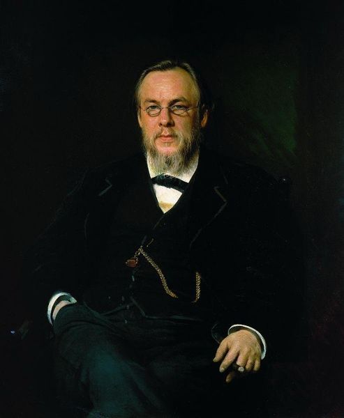 Ivan Kramskoy painted this portrait of the poet Yakov Polonsky with oil on canvas. The composition invites you to consider a figure emerging from darkness. Kramskoy's subdued palette, dominated by blacks and browns, is punctuated by the warm tones of Polonsky's face and beard, drawing our eye to his expression. The artist employs a rather limited range of colors, but it is the texture achieved through visible brushstrokes that adds depth and complexity. The portrait operates on a semiotic level, where formal elements become signs. The somber color scheme and the poet's contemplative gaze might symbolize the weight of intellectual thought or the melancholy often associated with artistic creation. The cane acts not just as a support, but perhaps as a symbol of authority or the burden of experience. Consider how Kramskoy’s formal choices reflect the cultural values of his time, where portraiture was not merely representation but an exploration of character and intellect. What do you make of Polonsky's expression as he gazes out of the canvas?
