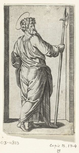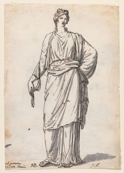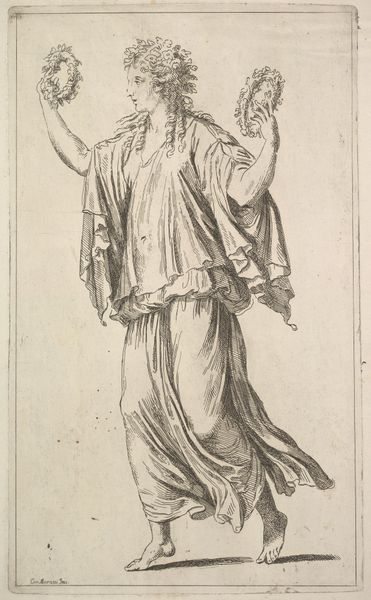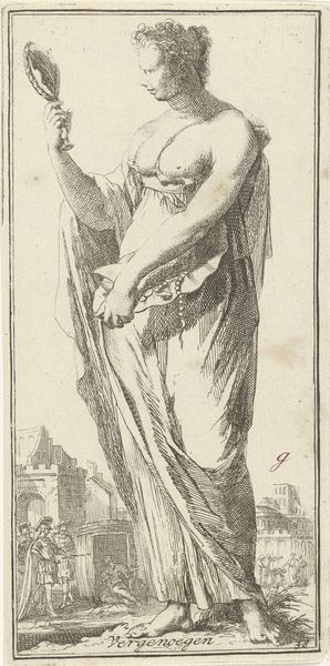 Editor: This is "Personificatie van de bouwkunst," or "Personification of Architecture," an etching from the 1710s by Arnold Houbraken. It has this slightly severe, almost didactic tone, and makes me think about the weight of tradition in architecture. What do you see in it? Curator: Weight is a good word. But to me, she's also draped in possibility. I mean, look at the compass in her hand, the blueprint in the other. It's like she's holding both the rules and the potential for breaking them. Don't you think? And behind her, isn't that the Tower of Babel? Ambitious, right? And perhaps a cautionary tale? Editor: It is ambitious! And now that you point it out, I see what you mean about possibility. But the Tower... wasn’t that punished for hubris? So is Houbraken celebrating architecture or critiquing its potential excesses? Curator: Oh, I think it's both, brilliantly. Like all great art, it poses questions, rather than dictating answers. Architecture strives for the heavens, but must remain grounded. Editor: That's a really helpful perspective. I’d only considered the one message: architecture's connection to power and permanence. Curator: Exactly! It's not just stone and mortar; it’s ambition, downfall, reinvention… and all held in balance by a figure in classical robes! Isn't history grand and delightfully complex! Editor: I love how seeing that potential ambition helps bring the figure to life! Thanks!