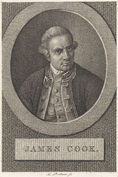 Editor: So, this is J.F. De La Rue's "Portret van J.J. Sagermans" from 1787. It's a print, an engraving. I’m immediately struck by the formal composition; it's very structured and… contained. What do you see when you look at it? Curator: Structurally, the image relies heavily on geometric forms. Observe the oval frame surrounding Sagermans, countered by the rectangular base. The stark contrast between the dark, tightly rendered figure and the lighter background establishes a clear foreground and background. Editor: Right, the oval really traps the portrait, almost like a locket. And what about the hatching, all those tiny lines creating tone? Curator: The engraving technique itself contributes significantly to the work’s overall effect. The density and direction of the etched lines meticulously define Sagermans’ features, lending volume and texture to his face and clothing. Notice the crispness of the lines. They contribute to the detailed and almost photographic representation of his persona. Editor: I hadn't considered the lines that carefully before. It's less about expression and more about... capturing a likeness, or a statement? Curator: Precisely. And what do you observe about the space created? Is there much depth? Editor: Not really, it feels quite flat. The figure almost presses against the picture plane, but it's interesting how the engraver managed to get a detailed image, even with the shallowness. It shows the engraver focused more on conveying information rather than a specific perspective, I now observe. Curator: An excellent observation. Through such analysis we can approach something akin to understanding. Thank you for bringing up a work of art from our archives! Editor: Likewise. It's good to have guidance when dealing with more structured and confined art works.