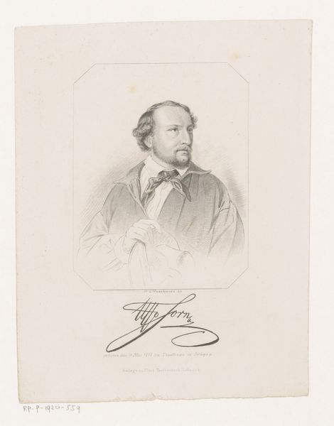 P.C. van Geel created this portrait of Carle Elshöecht as a lithograph around 1835. The print gives us a glimpse into the cultural and social values of the Biedermeier period, known for its focus on domestic life, and the rise of the middle class. The portrait captures Elshöecht with a certain level of detail that speaks to the importance of portraiture in solidifying social status and personal identity during this era. Notice the formal attire and controlled pose which reflect the subject's standing. At the same time, there's an element of romanticism in the tousled hair and intense gaze, hinting at the shifting cultural emphasis on individuality and emotion. The lithograph serves not just as a record of appearance, but as a document reflecting the complex interplay of social expectations and emerging ideals of selfhood. The very act of creating and preserving this image speaks to the ways in which personal and public identities were carefully constructed and maintained.