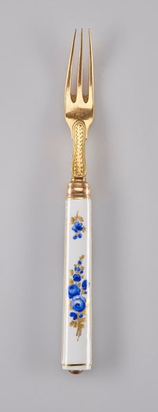 This fork was made by the Meissen Porcelain Factory in the 18th century. The golden prongs and the delicate blue floral motifs painted on its porcelain handle speak to the cultural memory of refinement and courtly life. These floral motifs, while seemingly decorative, are deeply embedded in cultural history. Consider the "Blue Flower" of the Romantic era, a symbol of longing and unattainable ideals. The blue flower, a common motif across time, appears in ancient Egyptian art as the lotus, representing rebirth. The same flower resurfaces in Renaissance paintings as irises, often associated with the Virgin Mary, signifying purity and hope. These floral depictions tap into our collective subconscious, stirring emotions of nostalgia and aspiration. Their presence on a simple fork transforms a mundane object into a powerful symbol of cultural memory. This intricate interplay between form and symbol reveals how even the most functional items can carry profound emotional and historical weight. The cyclical progression of such symbols shows their resilience and adaptability, continually re-emerging and evolving in different contexts.