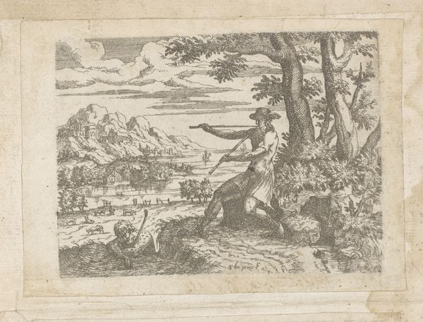 Cornelis van Noorde created this small etching, "Arrival of the Batavi," now at the Rijksmuseum. At the forefront, a figure stands, shield in hand, seemingly leading a group of people. This image hearkens back to the classical ideal of the noble savage, embodying a pure connection to nature. Notice the spear planted into the small hill, a symbol of dominance over the land. This act of staking a claim echoes in countless historical narratives. Think of the Roman standards planted in conquered territories, or even the flags raised by explorers in the New World. Here, the spear is not just a weapon, but a marker of cultural assertion, laden with psychological weight. It speaks to the human drive to possess and control, a deep-seated impulse that transcends eras. The emotional power of this image lies in its ability to tap into our collective memory, reminding us of humanity's continuous struggle for territory. Though created in the 18th century, it illustrates a timeless narrative that continues to evolve in our subconscious.