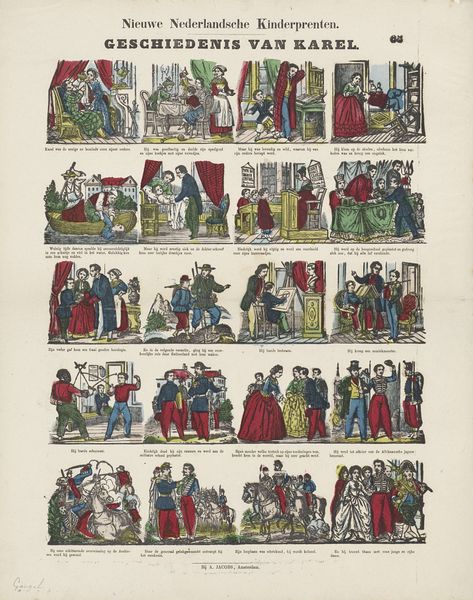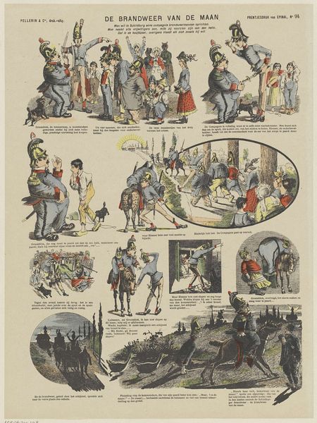 This is 'De gedaanteverwisseling van Polichinel' by Pellerin & Cie. and it's a print, probably from the 19th century, laid out like a comic strip. The way the colors are applied, so flat and bright, tells me it's all about storytelling, not pretending to be real. There’s a feeling of distance, like looking through a window, which I think comes from the printing process. Check out the panel where Polichinel is standing on a stool, he’s about to sneak out the window. The awkwardness of his pose—that slight tilt, the way he’s got one foot higher than the other—is just wonderful. The artist is embracing not being perfect, and that gives the whole thing such a lively energy. I’m reminded of the playful spirit of someone like Joan Miró, who wasn't afraid to be silly, and who also wanted to get away from the seriousness of traditional painting.