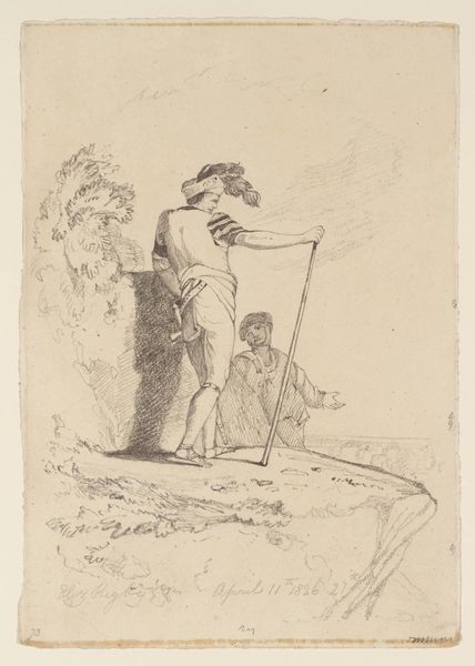 Curator: What a subtly rendered etching! The Rijksmuseum holds this print called "Hengelaar", attributed to Leendert Brasser, made sometime between 1727 and 1793. Editor: It’s melancholic. That solitary figure fishing, the muted tones—it evokes a quiet sense of longing, doesn’t it? A pastoral elegy. Curator: Indeed. Brasser’s technique here is fascinating. Look at the economical use of line to define form. The hatching creates a sense of depth, particularly around the figure and the distant village. Notice how the tree seems to arch protectively over him. The interplay between positive and negative space generates visual interest, too. Editor: The fishing rod extends as this linear connection. Is the figure a literal fisherman or might this act symbolize something more? Fishing as seeking, perhaps for knowledge, or a soul. This lone man set against this simple setting... it whispers stories about simple pleasures and introspective reflection. Even that far-off church implies moral virtue. Curator: Certainly, that steeple points the composition upwards to the spiritual level. You are making interesting claims, especially given the limitations of the medium. Etching tends to prioritize linear precision over tonal nuances. The composition leads us to an upward gaze; there is undeniable clarity of design despite being limited in greyscale and shade. Editor: Perhaps it's about that inherent lack that emphasizes reflection. How little does he hold in order to find deeper meaning? Think about what this image represents – the eternal search for purpose amidst the simple pleasures of a landscape. It seems a meditation on human nature and belonging. Curator: I still focus on the use of the "Line". He outlines, emphasizes and repeats, allowing viewers to come up with conclusions about shape on their own, as opposed to providing details in "shade", to evoke more conclusive emotional reactions. It may just be my preferences. Editor: Perhaps our interpretations only serve to reveal how strongly we hold onto different ideas. Regardless, a work such as this deserves exploration by generations to come! Curator: Indeed, it stands testament to artistic simplicity of that time. A humble treasure, if I may say so myself.