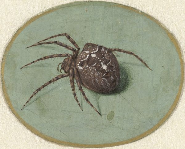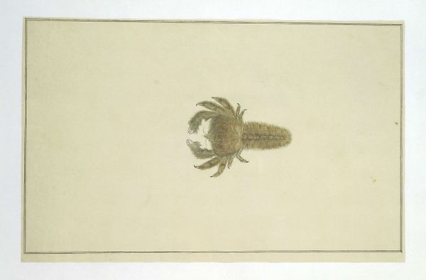 Jan Augustin van der Goes painted this crab with watercolor on vellum. The crab is centrally positioned on an oval grey surface. The crustacean's red-orange hue contrasts strikingly with the muted background, immediately capturing our attention. Van der Goes masterfully employs light and shadow to sculpt the crab's form, highlighting its intricate shell texture and the sharp edges of its claws. The detailed rendering transforms a simple marine creature into an object of meticulous study. This attention to detail invites a structuralist reading, where the crab isn't just a representation of nature, but a carefully constructed sign. We can see the interplay between the specimen's form and the artist’s technique. The precise lines and controlled washes of color serve to underscore the crab's physical characteristics, thus transforming the natural form into a codified image. This encoding speaks to broader artistic and philosophical concerns, reflecting a desire to categorize and understand the natural world through visual representation. The oval form provides a contained space in which the crab is displayed, underscoring our role as observer.