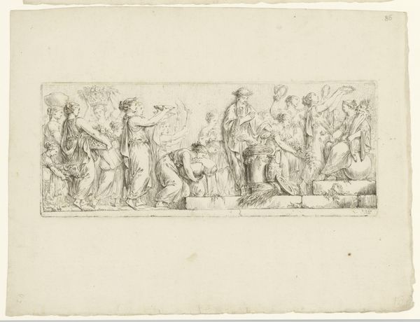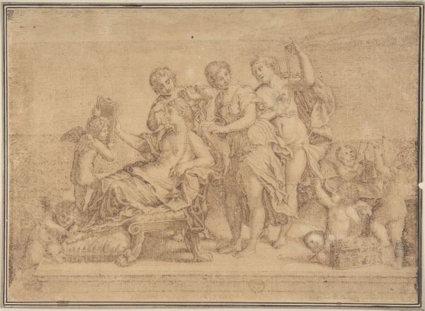 Curator: Look at this incredibly delicate pencil drawing. It’s called "Laatste Avondmaal," or "Last Supper," dating roughly from 1765 to 1807, attributed to Jan Tersteeg. It’s neoclassical, fitting the era. Editor: My first thought? Ghostly gathering. It’s all suggestion and barely-there lines, like a memory fading or an idea just beginning to form on the page. There’s something melancholic in the air. Curator: That’s apt. Consider the subject: it’s the final meal Jesus shares with his disciples before his crucifixion. That somber mood you pick up on? It’s deeply embedded in the scene’s narrative, magnified here in the fragile lines of this study. It may be rooted in neoclassicism, but this also makes for a study in precarity. Editor: Precarious is the word. The faces aren’t clearly defined. It could be anyone, anywhere, really feeling that dread realization wash over you. It seems very preliminary. Did Tersteeg intend this as a prep piece? Curator: Undoubtedly. The linear precision typical of the neoclassical style, which emphasizes order and rationality, is tempered here by the sketch’s inherent intimacy. You see those slight compositional adjustments in the bottom right corner? These are idea-generating processes at work. He is toying around. Editor: Almost like catching a glimpse into his thought process. It’s interesting how the ethereal quality emphasizes the profound loneliness inherent in that last supper. Jesus knew what was coming, right? This drawing makes that so palpable. There’s no dramatic gesture, no overly theatrical rendering... only quiet reflection. Curator: Exactly. In eschewing the grand drama favored by earlier Renaissance interpretations of the Last Supper, this sketch focuses on psychological depth. Its intimacy pulls us into the quiet horror of what will come to pass. Tersteeg perhaps explores it through the medium and his approach to preliminary rendering, even in its subtle ghostliness, and speaks to the heart. Editor: Makes you think about how the power of art lies just as much in what isn’t there, the unsaid, the ghostly presence, as it does in what's explicitly shown. It’s fascinating. Thanks for sharing the story, Jan. Curator: My pleasure, and yours is certainly an invitation to remember we are but a drawing when considering art through the scope of our history.