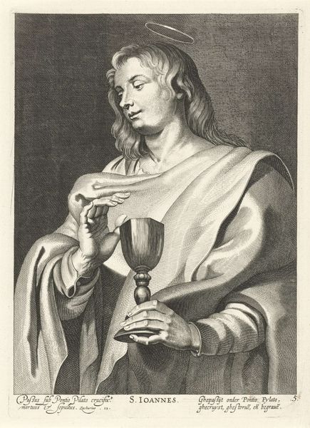 Curator: Here we have Cornelis Galle I's engraving "Ezechiël," created around 1613. It is currently held at the Rijksmuseum. Editor: There is a compelling vulnerability in this portrait. The upwards gaze lends itself to a reading of prophetic inspiration, yet the tight oval frame almost confines that very expression. Curator: The setting, combined with his folded hands, draws focus to the act of receiving a divine message. His physical containment serves a specific representational function, reinforcing a message delivered at a historical moment. We see how the engraver used the very texture of the figure's drapery to convey not merely form, but the gravity of religious conviction. Editor: Absolutely. Galle’s masterful use of hatching and cross-hatching certainly captures the density of fabric, giving volume and substance to Ezechiël's physical presence within the picture plane. It is also difficult not to be drawn into the geometry of the overall design itself, a self-contained geometrical meditation. The contrast is striking, setting emotional confinement and ecstatic expression against sharp precision and compositional constraint. Curator: Such considerations point us to understanding the power that artists like Galle wielded during times of socio-religious upheavals, serving as both narrators and interpreters of powerful shifts. Galle actively shapes perceptions of spirituality by placing his subject so carefully within these graphic structures. The lettering too plays an active role in solidifying symbolic interpretation. Editor: I concur. By situating him both textually and pictorially, Galle gives dimension to a symbolic rendering of the sacred through the deliberate control of the frame itself. Looking at it now, there is almost a complete fusion of visual signifiers, producing an affect-laden image designed to shape not only spiritual outlook, but religious fervor as well. Curator: Exactly, and that convergence of form and message, reveals much about how art operates in a larger historical field. Editor: Indeed, a single engraving holding within its borders, complex reflections on humanity, history, and perhaps the formal mechanisms of representation itself.