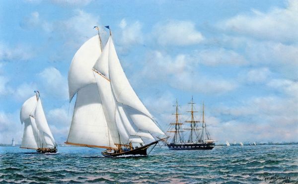 Antonio Jacobsen made this painting of The American Clipper Ship Gamecock, probably around the late 19th century, with a real feel for ship life, like he knew it firsthand. The brushwork is so careful, especially in the details of the rigging and the way the light catches the sails, it's clear that the process itself was key for Jacobsen. Looking at the paint itself, it's pretty smooth, not too much texture, which lets you focus on the shapes and colors. The way he's handled the waves is great - these little choppy strokes of dark blue and white, really giving you that sense of the water's surface. Then, those crisp white sails against the pale blue sky, it’s kind of romantic, right? There's this one tiny American flag waving proudly; you can almost feel the breeze. It's these little things that make the whole piece sing. Jacobsen’s approach reminds me a bit of Fitz Henry Lane, another marine painter, but Jacobsen has this added layer of detail. Ultimately, this painting is about a moment, a feeling, and the enduring power of simple observation.
