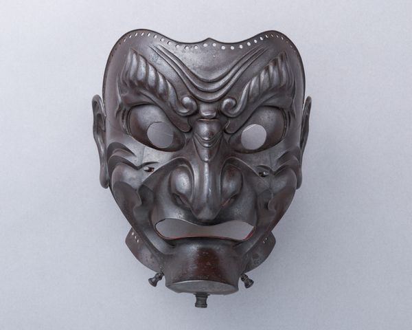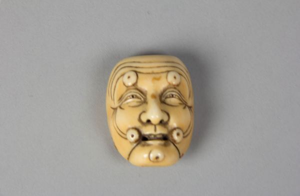 Editor: So here we have a 'Netsuke', crafted between 1800 and 1825 by Hidemasa, made of wood. There’s something fascinating, yet a little unsettling, about this sculpted face. It is compelling with the material craftsmanship evident. What elements jump out at you? Curator: Note how the form prioritizes concise, self-contained volumes. Observe the formal interplay between curvature and angularity, as evident in the planes that describe the eyes and snout. Editor: It almost seems mask-like. Curator: Indeed. And how does the medium, wood, itself inform your understanding of this piece? The wood grain directs and contours your looking, and seems inherent to the very figure depicted. Editor: I see what you mean; the artist used the texture to their advantage. The smoothness emphasizes some areas and draws attention to fine carvings and sharp lines in other locations. Can that be a symbolic intention too? Curator: Semiotics are, of course, ever present. Note, however, the structural choices. We might say, the artist has deliberately left the reading 'open'. I would encourage reflection on form first, then consider how a structure makes possible your experience. Editor: That makes me appreciate how technique shapes perception; thank you for illuminating how to appreciate the object itself. Curator: The process of rigorously describing such intrinsic values, the sculpture's very shape and makeup, is the key to seeing art with clarity.