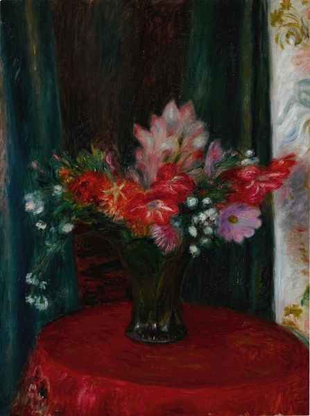 Curator: This pastel drawing presents a vibrant bouquet, entitled "Vase D’anémones," attributed to Odilon Redon. The eye is immediately drawn to the jewel-toned anemones. Editor: It feels so dreamy! The texture of the pastel is really evident, lending a soft, almost ethereal quality to the whole scene. You can practically feel the powdery pigments. Curator: Precisely. Redon’s technique is central to its mood, don't you think? It allows for these soft gradations of color and a real sense of immediacy in its creation. The choice of pastel over oil, for instance, implies something about speed, but also accessibility. Consider the labor that would go into preparing an oil painting! This medium implies something about access to the work. Editor: True. And think about the tradition of flower painting, too. Where does it fit in terms of the art market and broader societal tastes at the time? Flower painting offered both female and male artists more financial opportunity due to middle class home decoration interest in floral imagery. Curator: An excellent point! Flowers also occupy an ambiguous place in the artistic hierarchy as many associated flowers with decorative arts, with craft—categories long feminized and seen as less important in terms of painting, or more broadly, in high art. Editor: It's intriguing how he pushes against that a little with these vibrant and bold colors. What do you suppose Redon would have had to go through to get these pastel pigments? I wonder if the availability of color impacted Redon’s interest in the image? The bright jewel-like tones. Where were they sourced? What was their original purpose and usage outside the fine art market? Curator: Sourcing pigment touches on art-making and materiality that so many disregard. Beyond sourcing we must question the accessibility to tools, too, to proper paper. That so few flower images exist compared to other subjects may simply touch on access! These beautiful pastels could signal broader democratization of artistic materials and subjects. Editor: I hadn't considered it quite that way. This new look at sourcing and materiality, labor and context really brings a whole new dimension to "Vase d’anémones"! Curator: Absolutely! It’s never just about what we see, but about how it came to be.