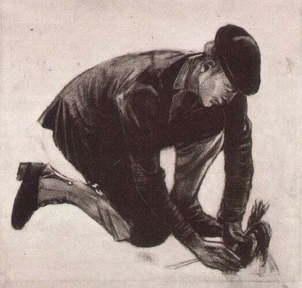 Editor: So, this is "Three Woodcutters Walking," a charcoal and pencil drawing by Vincent van Gogh from 1884. There's a starkness to it that I find immediately compelling, and the monochromatic palette really enhances that mood. What catches your eye when you look at this piece? Curator: You know, it's interesting how van Gogh takes such an ordinary subject and imbues it with so much…weight. It's more than just three figures walking. I sense their weariness, the repetition of their days etched into each line of the charcoal. Notice how the trees almost mirror the figures, becoming part of this somber procession. There’s a bleakness here, an unflinching look at the lives of these laborers. Do you feel that too? Editor: I do, now that you point it out. The mirroring is really effective. I hadn’t quite connected the trees to their figures, but now it gives a sort of feeling of oppression; everything seems heavy. Was he trying to make a social statement, maybe? Curator: Perhaps. Or perhaps he was simply observing, bearing witness. But van Gogh’s vision, as you know, was never simply objective. He translated what he saw through the prism of his own empathy, his own struggles. The rawness of the medium, the stark contrasts…it all speaks to a deep connection with his subjects. The act of walking is, in this piece, transformed from mundane travel to laborious passage of the everyday, isn't it? Editor: It definitely is! Seeing it that way makes it even more profound. I'll never look at a sketch the same way again! Curator: Indeed. Van Gogh opens our eyes to seeing poetry where we expect the pedestrian.
