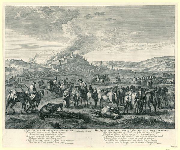 Jan van Huchtenburg created this print, "Entry into the Conquered Namur," in 1695, recording a military triumph. The printmaking process, specifically etching or engraving, allowed for the wide dissemination of such images. Consider the labor involved: the artist's skilled hand meticulously incising lines into a metal plate, a process demanding precision and control. Ink is then forced into these lines, and the image transferred to paper under immense pressure. The resulting print is both a work of art and a form of propaganda, idealizing warfare. This ability to reproduce images en masse was crucial for shaping public opinion in an era of burgeoning nationalism and military conflict. The print becomes a commodity, traded and consumed, its value tied to the social and political context it represents. By appreciating the material process and its social implications, we can move beyond the image itself, understanding how art and craft intersect with wider issues of labor, politics, and consumption.