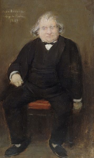Curator: Jules Bastien-Lepage painted this portrait of Simon Hayem in 1875, using oil on canvas. What are your initial impressions? Editor: A certain melancholic gravity hangs over the piece. There is an immediate tension created by the contrast between the sitter's formal attire and the dark, almost oppressive background. I find it somewhat claustrophobic. Curator: I'm drawn to the texture. Look closely at how Lepage has built up layers of paint, especially around the face and hands, using visible brushstrokes. The effect is quite dynamic despite the static pose. Consider the subtle use of impasto—it enlivens the surface and models form without reliance on stark value contrasts. Editor: I'd like to understand how the sitter, Simon Hayem, positioned himself within the cultural politics of his era. Lepage created this portrait as a "souvenir", as seen from his inscription on the lower left. As such, this image might convey Hayem's status and alliances in society, using elements of fashion and pose to indicate a certain kind of cultural agency. For instance, does his red ribbon connote an alignment with revolutionary politics or national identity? Curator: Note also the sitter’s rather contemplative, interior gaze. The painting presents a clear and well-ordered arrangement, the subject occupying a clear focal point, grounded against the dark background. The formal qualities give an air of respectability. This structured pictorial space seems quite purposeful. Editor: Perhaps, but how does the sitter perform respectability? A portrait is always a collaboration, and I wonder about the power dynamics involved. How might his identity—religious, professional, familial—intersect with societal expectations, influencing both his self-representation and Lepage’s portrayal of him? The darkness in the background could be seen as both an aesthetic and a metaphorical device: obscuring and thus subtly hinting that our sitter may come from the shadows of a minority class, which might, indeed, also subtly inform a critical, intellectual perspective. Curator: Ultimately, the interplay of line, colour, and form creates a powerful study of human character. One that seems as equally rooted in technical mastery as it does an exercise of careful compositional control. Editor: Agreed. And it pushes me to consider the relationship between visibility, representation, and historical narrative within the framework of 19th-century portraiture. Thanks for sharing this fascinating glimpse into a bygone era!
