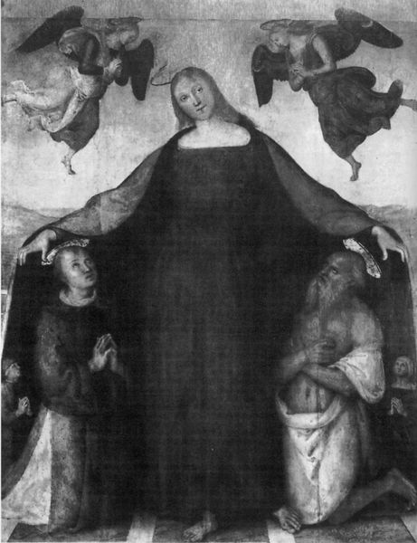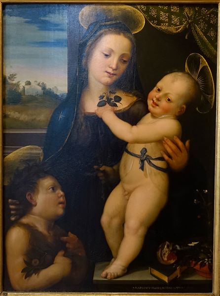 Editor: This panel, "The Virgin and Child with Saints Jerome and Francis," an anonymous work after Raphael, is quite striking. The figures have a compelling sense of gravity. What symbols stand out to you? Curator: Note how the artist has adapted Raphael's original composition, maintaining the pyramidal arrangement that emphasizes stability and divine order. Do you see the significance of Saint Jerome's presence and the symbolism of Saint Francis's gesture toward the Christ Child? Editor: I see Jerome's scholarly association and Francis's humility, but how do they connect with the Virgin? Curator: These are potent visual reminders of faith, learning, and service, each echoing the Virgin’s own devotion and her son’s destiny. The painting becomes a meditation on the path to salvation, a visual sermon, if you will. Editor: Fascinating! It's like the painting invites contemplation on multiple levels. Curator: Precisely. It reminds us how art can serve as a powerful repository of cultural memory.