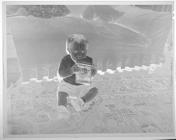 Editor: This is an untitled photograph by Lucian and Mary Brown, showing a boy at play. I’m struck by how even simple toys seem imbued with meaning. What catches your eye in this image? Curator: The boy and his toys become stand-ins for universal themes. The blocks are the building blocks of life, childhood, identity. The bird wallpaper hints at freedom or a desire to escape domesticity. What do these symbols evoke for you? Editor: I guess I hadn’t considered them so symbolically. The wallpaper felt more like a dated aesthetic choice. Curator: Perhaps. But symbols are often layered, right? The birds might be both a stylistic choice and a subconscious yearning. It invites us to consider how cultural narratives are built through everyday imagery. Editor: That’s a really interesting way to look at something so simple. It's amazing how much depth can be found in the most unassuming image.