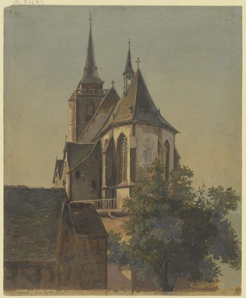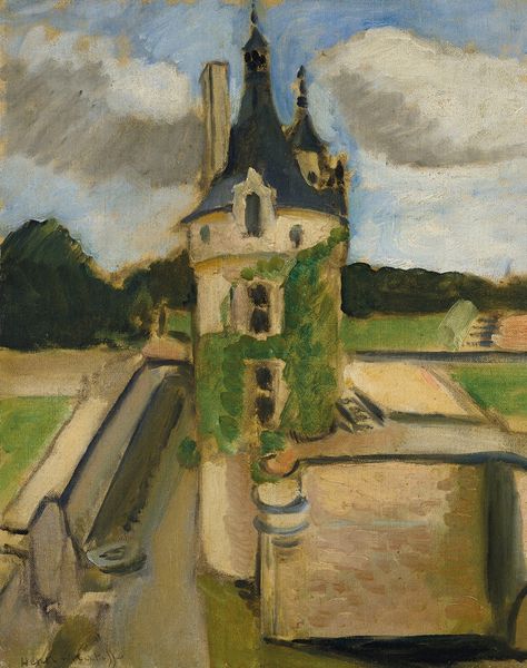 Curator: We are looking at "Church in Kysak" by Ľudovít Čordák, an oil painting created in 1923. Editor: The thing that hits me first is the light; it feels soft, filtered, even. Not dramatic, but quietly observant. You can really sense the texture of the paint, those small visible brushstrokes building up form. Curator: The church itself is an imposing structure, though painted in a rather unassuming palette. Churches often symbolize community, faith, and historical continuity. What strikes you about this particular one? Editor: There's a kind of material austerity here. It’s clearly not a wealthy or overly ornamented place. It suggests a history of simple labor, the church built perhaps by the very people who worshipped within it, its stones and mortar speaking of practical faith. Curator: I agree, there is a visual sense of lived experience ingrained within. Notice the simple graveyard indicated by a weathered cross – an immediate visual connection to mortality and remembrance. Perhaps a connection to the church's central symbolic role in marking life's passages. Editor: And that paint! It's thickly applied, especially on the sky, almost like a physical manifestation of the atmosphere itself. The artist really used the oil paint to convey a feeling of substance. One can feel the labor involved in moving the substance of color with his hands across the canvas. Curator: I see your point about labor; the materiality reinforces a connection to both the divine and the terrestrial. The building is simultaneously solid stone and painted representation, referencing history and technique. Editor: For me, it comes down to that paint. How Čordák made the ordinary extraordinary just through his process and what must have been quite a lot of sheer effort moving pigments around. Curator: Thank you. A poignant testament to both spiritual aspiration and earthly effort, made of pigment, canvas, and the artist's unwavering attention. Editor: Agreed. A painting about presence, in place, and material.