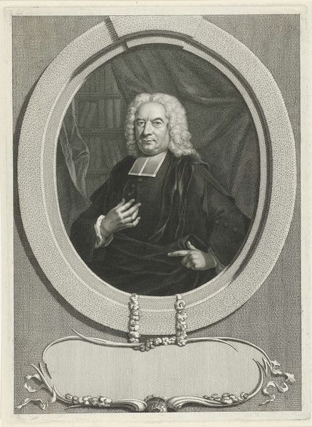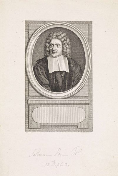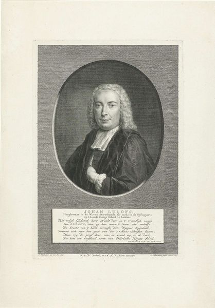 Curator: Before us is Jacob Houbraken's "Portret van Herman Schijn," an engraving from somewhere between 1727 and 1780. It's housed here at the Rijksmuseum. Editor: It's immediately striking—almost austere. The stark monochrome palette coupled with the rigid lines evokes a sense of serious contemplation. It seems to echo an elite and solemn class. Curator: Houbraken was, above all, a portraitist. He made many engravings and, especially in Amsterdam, reproduced them on a large scale. Looking at the subject, we must consider the limited perspectives of his era in the way artists reproduced an image of those of wealth and nobility. Herman Schijn himself would've commissioned or approved of the printing; consider how the material demands affected his decision-making about public persona and its perpetuation through engravings like these. Editor: You bring up such great considerations. For me, this reminds me of that point in art when prints became mass commodities. This form breaks away from individual artistic interpretations to become a social mirror; the print facilitates a kind of manufacturing of identity. Schijn, I feel, isn't just any man here, he is meant to embody, or materially represent, ideas tied to that period. His image would've had, essentially, wide distribution. What are your feelings? Curator: He may have commissioned Houbraken, in his social circles, to gain status, but also because printmaking during the baroque style provided accessibility to knowledge. Baroque often amplified emotion, sure, but think about who controlled which emotions, who even HAD a public emotional life! We need to see this print, not just as capturing Herman Schijn as an individual, but consider, even subtly, his position, relative freedoms, compared to others whose portraits wouldn't hang here. Editor: So the materiality of the engraving--its accessibility and reproducible form--actually underscores social and cultural power? Interesting, indeed, in how these images became tokens, and in today’s economy, might now circulate as a sign for collectors, galleries, and here in the Museum as the place it takes as one piece among others, now made invaluable. I never thought that something mass produced might convey these ideas so effectively. Curator: I agree; I see Schijn's gaze looking towards the present as much as representing a static past, even as the material form it's etched on speaks quietly to an elite control of art production. Editor: I’m really taken by its historical process and context now, and my view is nuanced.