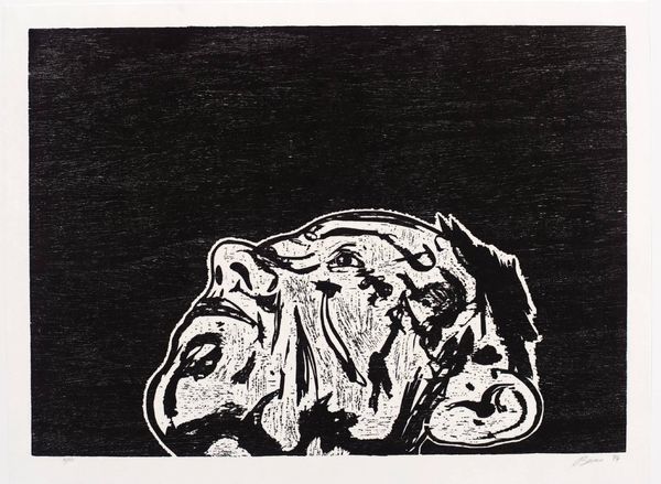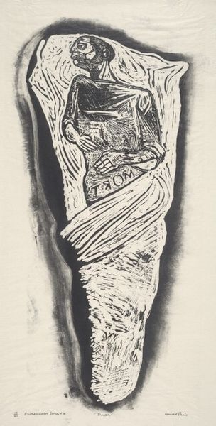 Curator: Tony Bevan’s “Blackwater," part of the Tate collection, presents us with an image measuring 1223 by 840 millimeters. The stark contrast immediately strikes me. Editor: Yes, it has this rough, almost brutal quality. You can practically feel the labor involved in creating such a textured surface. Curator: Indeed, the bold lines create a visually arresting composition. The figure seems almost trapped within the space. Editor: I wonder about the process—what tools were used? How much pressure was applied? The physicality is key. Curator: Perhaps the artist aimed to evoke a sense of confinement, a psychological struggle rendered visible. Editor: It’s a strong piece, demanding that we consider not only the image, but also the hands that brought it into being. Curator: Precisely, a confluence of form and meaning. Editor: Food for thought.