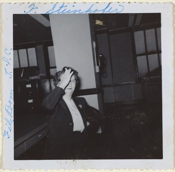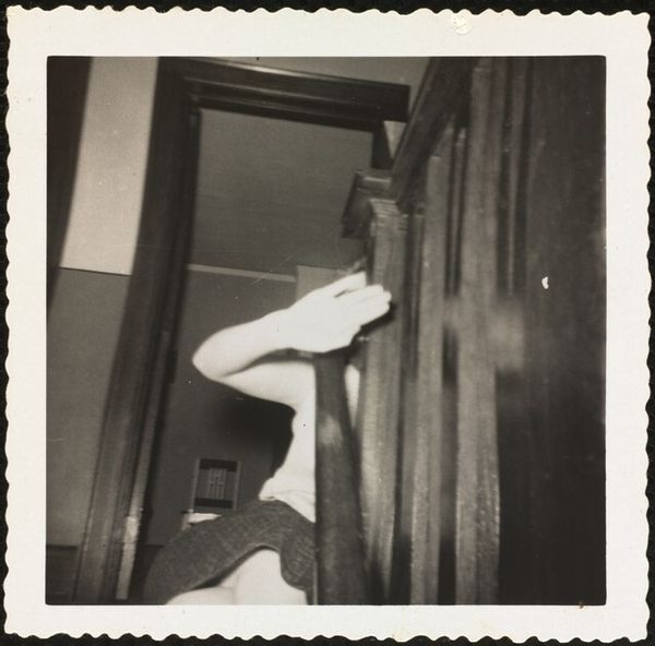 Curator: This is an interesting find from 1956, a snapshot simply titled "Ruth Nelson." It’s a black and white photograph with an everyday feel, almost like a personal memento. Editor: Yes, and my immediate impression is a sort of vulnerability or awkwardness. The figure is partially hidden behind the doorway. There’s something almost voyeuristic about the image; the grainy texture feels unrefined. Curator: Exactly! Looking closer, we have this figure peeking out, the flash adding a harshness. The setting appears to be indoors, perhaps a bathroom, with utilitarian objects. It raises questions about the subject’s role in society at the time, doesn’t it? Editor: Indeed, and if you consider that flash photography requires resources, both materials and labor—to what end was this image created? Also note the choice of framing. I find the visible machine behind her figure quite jarring, but it also feels purposeful. What was the photographer hoping to achieve by staging or finding such an intimate setting for this portrait? Curator: These snapshot portraits were very common, but in our time we tend to dismiss this type of amateur picture as not valuable art. What do you think about that? Editor: Not true, because those works challenge traditional art hierarchies by finding a new way for representation, it elevates domestic scenes of the middle class, and makes very complex and accessible representations. Curator: Certainly, its accessibility is appealing. And the focus of our conversation circles back to the way social context is revealed through even simple materials and compositions. Editor: Right, the social context deeply embedded within the artistic means is what allows a snapshot to surpass its time period to become valuable for the culture.