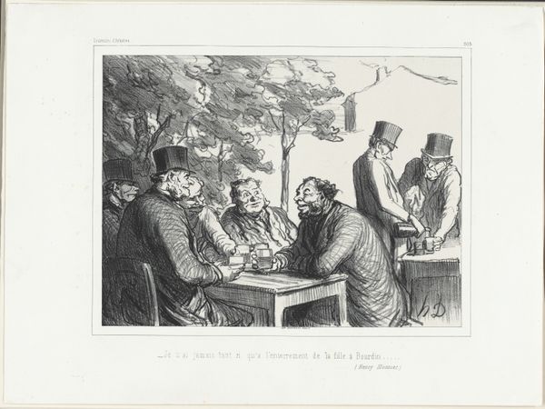 Curator: Ah, the eternal game, depicted in this lithograph and ink drawing, "Cinq coeurs, quinte et quatorze…," by Honoré Daumier from the 19th century. Immediately captivating, isn’t it? Editor: Absolutely. My first impression? Restless energy, but a kind of trapped energy, almost. Look at the lean of that figure, poised between argument and flight. Like a coiled spring about to burst. Curator: Daumier certainly knew how to capture a mood. The whole scene speaks to the social fabric, and in many ways the caricatures stand as potent symbols. The artist has perfectly rendered the nervous body language of the man in mid-speech versus the older man, who has just played his cards with such a resigned pose. Editor: Yes, notice the hand on the table – an attempt at calm perhaps? Then, what does card-playing signify here? Obviously gambling, but also chance, risk, veiled aggression? Do the suits reference anything in particular? There is more than money on that table for sure. Curator: Undoubtedly! Cards can stand for both fortune and folly, it has become a very well-recognized motif through time. This almost certainly mirrors the cutthroat political games being played at the time. Even the quick, restless line-work creates a sense of nervous excitement in this everyday scenario. And the text at the bottom! It looks like there's an admission of loss, an invocation of the devil, and a hurried exit. A tableau of mid-19th century anxiety. Editor: Beautifully put. This tension he conveys, it touches on universal anxieties really, especially within closed-door negotiations, financial and emotional stakes all tangled. What seems to be at play in the dark tones on this lithograph? The play of shadow against light amplifies the whole emotional depth in the drawing, it's almost claustrophobic in the way they fill the scene. It gives it a palpable air. Curator: Indeed. And in this context, Daumier seems to remind us how close we are from civility to utter despair. The light and shadow add layers of meaning; this work reminds us that time does not change, only recycles the symbolic narrative. Editor: You're so right. I leave with an even stronger appreciation.
