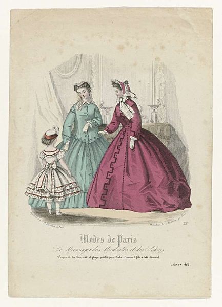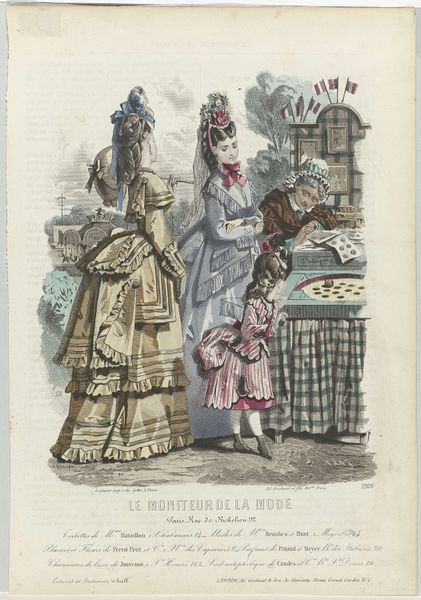 J. Bonnard's "De Gracieuse, Geïllustreerde Aglaja, 1870," captures women's fashion through the symbolic language of clothing. The elaborate dresses, adorned with layers of fabric and intricate details, reflect a culture fixated on appearance as an indicator of social standing. These garments are not merely textiles, but emblems of status, echoing the ways classical drapery was used to distinguish figures of importance. Consider how the folds and arrangements of robes in ancient sculpture served to elevate the subject, creating a visual hierarchy, a visual language that has since evolved in similar, if more complex, forms. We can also trace the lineage of dress and ornamentation back to ancient rituals, where specific patterns and materials were believed to hold power. Even here, the subtle details and colors could hold subconscious cues, engaging viewers on an emotional level. What does the color, composition and shapes of these dresses tell us, psychologically, about the women who wore them? Thus, the dresses in this image, though seemingly simple, continue a long, cyclical progression, resurfacing and taking on new meanings in the ever-evolving tapestry of cultural memory.