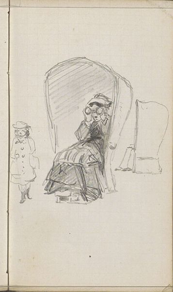 Frédéric Houbron created this pencil drawing called “Deux personnages sur un banc,” or “Two figures on a bench,” some time during his career in the late 19th century. Houbron was active in Paris at a time of great tension between the academic establishment and independent artists. This sketch of two figures on a bench may represent a fleeting glimpse into the lives of ordinary people, a theme that resonated with many artists of the time. However, it would be interesting to consider where this bench might be located. Is it a park bench? Is it in a waiting room? The architecture in the background is ambiguous. The bench appears to be in a somewhat public space, yet the figures seem isolated. To understand Houbron’s artistic choices better, we can turn to archival sources like exhibition reviews, personal letters, and critical essays. The meaning of art is never fixed, but always unfolds in relation to its social and institutional context.