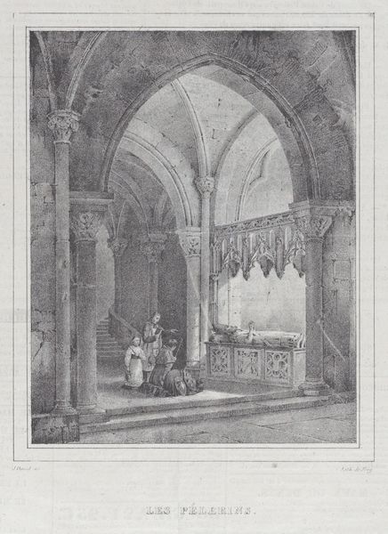 Curator: This is "Kerkinterieur," or "Church Interior," an engraving by Eberhard Cornelis Rahms, created in 1864. Look closely, and you can appreciate the intricate details he captured in this scene. Editor: Oh, wow. It feels cavernous, almost dreamlike. The light seems to emanate from everywhere and nowhere at once, softening the rigid architecture. A quiet hum captured on paper. Curator: The use of engraving allowed Rahms to achieve a remarkable tonal range. Notice how he creates depth through the meticulous cross-hatching and line work. This wasn't a quick sketch; this was deliberate, time-intensive labour. The cultural context of printmaking—its accessibility versus painting—is also quite telling here. Editor: I'm struck by the figures within. They’re these small pockets of humanity swallowed by the vastness, but somehow they seem connected to the space, you know? Huddling, or pausing…like moths drawn to a faded holy light. And the choice to depict ordinary folk and not a grand ceremony makes it very interesting. Curator: Exactly! It reflects the Realist movement's focus on everyday life, democratizing the subject matter for art. This print becomes a document of its time, illustrating both architectural grandeur and the daily routines of ordinary people within it. Editor: I'm guessing that depicting a church in the 19th century, would be very symbolic to its society? A reflection of beliefs, community, and maybe even a subtle critique? Curator: Precisely. These buildings were, and still are, expressions of societal power and wealth. This scene doesn't shy away from the stark juxtaposition of the sublime and the mundane. The people are literally dwarfed by their environment, the product of many hands. Editor: It’s kind of haunting. Almost makes you feel a bit like an intruder, peering in on a private, echoing moment. The artist uses perspective as a type of filter or portal for us to access that time. Curator: Indeed. And considering that printmaking at this time was an established medium for the distribution of news and information, images such as "Kerkinterieur" served both an aesthetic and informative purpose. The accessibility allowed many more people to view architecture. Editor: Well, looking at it now I understand the historical layers to the engraving and can't deny the labor in Rahms' work! So it does what art should do. Gives space for different eyes to witness a dialogue of art.