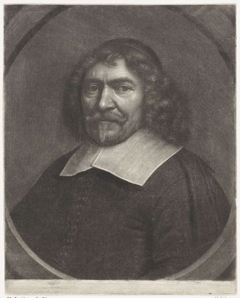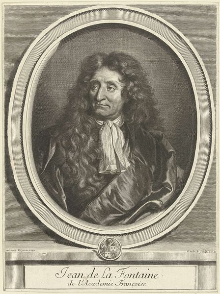 Curator: Looking at this engraving by Bernard Vaillant, made sometime between 1642 and 1698, titled “Portret van de schilder Hadrianus van der Spelt,” I’m struck by the weight of history. Editor: I agree! My first impression is one of deep contemplation, almost melancholic. There's a gentle quality despite the graphic nature of the print. The rendering of his hair and face feels incredibly intimate. Curator: Considering Vaillant's career, he captured a fascinating moment in Dutch art, producing portraits and genre scenes alike. However, looking deeper into this work, portraits during that period are not neutral but often assert particular status or lineage. I wonder what claims this portrait wants to make? Editor: Yes, that gaze…It's almost unsettlingly direct, daring us to see him. But then I zoom in, I notice that soft rendering of his facial features, which contrasts with what might otherwise seem like a formal Baroque presentation, softened by the medium and a sense of the fleeting nature of life. You almost imagine the portrait is done by a painter with a good dose of empathy for this sitter. Curator: Absolutely, but it’s also interesting to note how these images circulated—serving various functions, as tokens, as keepsakes but also serving for purposes of legitimization within social and economic power structures, reflecting on access, legacy, influence and prestige. I cannot help but reflect how these seemingly mundane, historical records were an important way that communities solidified cultural status in Europe, for example. Editor: Right! There's this tension, isn’t there, between its almost bureaucratic function and its inherent capacity to hold so much…presence, even feeling. Vaillant seemed to really seize upon the almost fleeting expressiveness of his face. But those piercing eyes and loose waves… such personality. Curator: It certainly seems to give more expression to personality over strict power displays that typified many state portrait commissions, and the engraver gave van der Spelt perhaps a different reading and agency than a painter who’d have sought to flatter the sitter by any means! Editor: Precisely. All those layers are part of the piece now, even as we receive them differently today. And maybe Hadrianus is looking at all of us! It's an intriguing idea that a Baroque piece such as this could also contain layers of proto-feminist or progressive ideology if seen by 21st-century eyes! Thank you, Hadrianus! Thank you Bernard. Curator: It certainly is powerful and enduring.