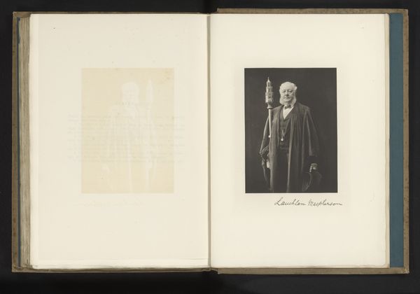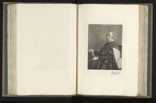 Editor: So, here we have a photograph, a gelatin-silver print called "Portret van William Jack," created sometime before 1891. It’s nestled within the pages of what looks like a very old book, opposite some printed text. There's a certain solemnity to his expression, a very serious gaze. What strikes you about this portrait? Curator: Isn't it curious how time telescopes in such images? He stares out from this fragile emulsion, from behind the veil of time, and we're right here looking back! What's wonderful about a portrait like this is it suggests the weight of experience, right? And also, this very palpable *connection* to the past that photographic realism enables so vividly. Do you feel like you "know" him a bit? Editor: I do! In a way. It's that directness, perhaps. All that's really in the photo are neutral colors that give this quiet effect. But this "realism" that the photo presents--was that the artist's aim, to present someone as "real?" Curator: Ah, there's the juicy question! That era *adored* realism, yes. But there’s always an artistry isn’t it, to what we *choose* to show? A careful selection of posture, setting, even clothing. Notice that coat, and how it is a shade lighter than the suit underneath: a calculated move that leads my eyes towards his face and gives the picture volume! The way light falls on the face--does that feel happenstance or deliberately orchestrated? What would "William Jack" want us to know? And what little details—the unsmiling expression, the careful grooming—might give away his secrets, perhaps against his will? Editor: That makes so much sense! It really changes how I see it—it’s more constructed and mediated than I first assumed. A collaboration almost, between sitter and photographer to project something. Curator: Exactly! Photography, we tend to assume is "truth". And here in lies its peculiar magic--its beguiling falsehood! Which is itself an entirely human creation, if you think about it... Editor: Wow, that is quite interesting, it definitely shifted my views on older photos and portraiture in general. I am going to have to explore photography more as art and less as a true visual representation.