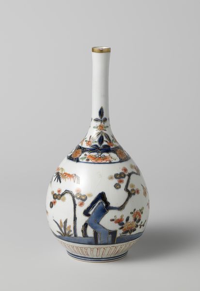 Curator: Here we have an exquisite pear-shaped bottle vase, crafted around 1700-1724, now residing here at the Rijksmuseum. The piece is rendered in porcelain with a striking powder-blue glaze. Editor: Immediately, the contrast is striking. That deep blue is so intense, yet it's juxtaposed with this delicate, almost whimsical central motif. Visually, the colors play beautifully, offering a balanced asymmetry. Curator: The floral sprays and "antiquities" depicted aren't mere decorations. The making of porcelain, especially with such refined cobalt pigment, was a complex, international affair during that period. What does the material tell us about its context? The cobalt itself would have been imported to get that blue. Editor: Indeed, and that cobalt blue almost swallows the floral arrangements in places. If you observe closely, notice the detail along the rim with the repeated geometric patterns adding another visual texture. The narrow neck creates such elegant linearity; a fine addition to a classical vase. Curator: These vases reflect more than artistic skill; they are also indicative of intense material resource supply chains across continents and the skilled labor needed to produce them, where Chinese artisans would export to European markets keen for trade. We have to understand who consumed these goods. The rise of tea consumption for instance, would have increased demand. Editor: Perhaps, or the placement of design adds a focal point against a backdrop of powdered blue: what cultural messages is conveyed to viewers from composition or decoration on the ceramic canvas itself? Curator: Exactly. What story of cross-cultural exchange is being told when porcelain intersects with economic, material and cultural histories in an intimate vessel intended to furnish wealthy homes. Editor: Right. Focusing on the vase has helped me observe how complex histories and delicate craft meet and form one object. Curator: It becomes much more interesting thinking through both production processes and also form at once.