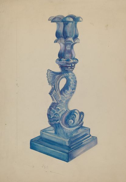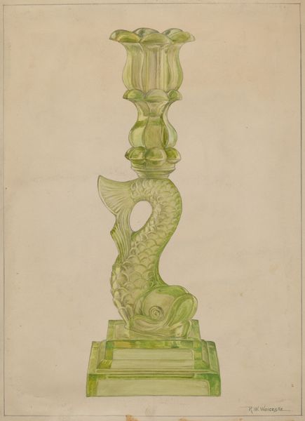 Curator: I find the clean lines of the “Dolphin Candlestick” rather striking; the design aesthetic reminds me of the art deco period. Editor: Immediately I feel an odd tension. Its playful shape juxtaposes oddly with the weight it intends to hold—it's a pretty object burdened with practical, ceremonial tasks. Is that intended to be light-hearted or subversive, do you think? Curator: Considering its materiality, paper with watercolor and colored pencil, and given the production date circa 1935, I'd wager it represents a concept for a functional piece rendered in preliminary form. The geometric shape of the base, echoed in the candlestick top, provide symmetry; it has some refinement. Editor: True, that repetitive geometry offers structure. But looking beyond its formal qualities, who gets to use something like this? Was the dolphin form referencing something very popular in the decorative art era, something from Classical myth or maritime culture, I wonder. Curator: Dolphins certainly were a common motif, yes, but let’s get back to its lines. Note how the artist balances curvilinear forms of the dolphin with sharp angles. See how the tail subtly mirrors the flare of the candlestick holder itself, creating visual echoes that reinforce unity? Editor: Certainly. However, this reading seems to exclude the original context. Without knowing whose home this object might eventually have inhabited, or the role that interior design played in constructing and reinforcing class and gender identities at that moment, we can never know the intended purpose. Curator: Those details elude us. Yet the enduring composition itself testifies to lasting aesthetic appeal. The very rendering, and its potential future form, communicates design regardless of use. Editor: Maybe...for me, I feel a tension, unresolved and intriguing. It evokes longing for domestic scenes layered with the complexities of wealth and aesthetic taste in an era of political change. What a story this single object tells.