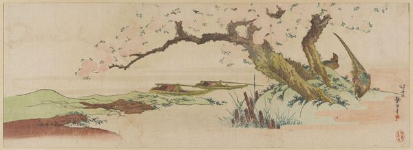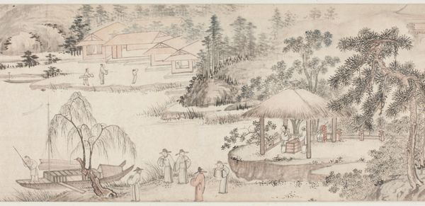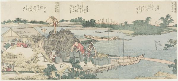 Editor: This is "Rural Scene in Early Summer: Peasants Transplanting Rice and a Man Washing a Horse," a woodblock print by Katsukawa Shun'ei from the late 1790s. It depicts everyday rural life in Japan. The flatness and stylized figures remind me a bit of folk art. What jumps out at you when you look at it? Curator: Well, the material production interests me. Shun'ei’s print, mass produced for popular consumption, blurs boundaries between 'high art' and 'craft'. Think of the labor involved: from the artist’s design to the carving of the woodblocks and the final printing process itself. Who were the artisans involved, and how did their labor shape the final image? Editor: That's interesting! I hadn’t considered that so many hands touched it. How does that change our perception? Curator: It repositions the artwork. The final product reflects a network of makers and their specific social context, more than solely the vision of the artist. How does the act of repetition in printmaking influence how the image circulates and is consumed? Is it a commodity, a work of art, or both? Editor: I suppose it's all those things. The print makes the scene accessible, something many people could own and reflect on. Curator: Exactly. The availability via print and relative low cost democratizes the image, and suggests a wider appreciation for the beauty and work of rural life. And what does it say about class? Who are these images *for*, who is *making* them, and what kind of cultural consumption do they represent? Editor: I didn't realize there were so many layers to consider in a seemingly simple print. It gives me a new perspective on how to examine art. Curator: Thinking about materials, process, and the broader social context really opens up our understanding, doesn't it? It's all connected.
