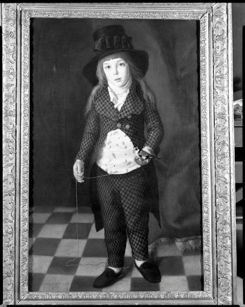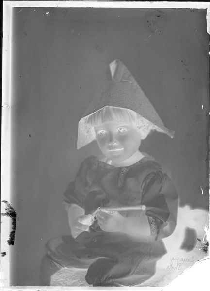 Curator: This photograph from the Harvard Art Museums is titled "Untitled (portrait of child in 'Buster' hat)" and created by John Deusing. Editor: Initially, the inverted tones create a slightly eerie effect, but the child's costume and hat add an intriguing layer. Curator: Exactly, the “Buster” hat is a direct reference to Buster Brown, a popular comic strip character who represented youthful mischief and middle-class aspirations. Editor: That certainly shifts the focus. The composition itself, with the child centered, emphasizes a certain idealized innocence, even with the photographic inversion. Curator: It's a constructed image, reflecting early 20th-century ideals about childhood. These kinds of studio portraits played a role in shaping societal expectations. Editor: And the materiality of the photograph—the grain, the tonal range—contributes to its antique feel, further distancing us but also drawing us in. Curator: It reminds us that even simple portraits can be powerful cultural documents. Editor: I agree. It's a fascinating artifact offering much to consider beyond its surface.