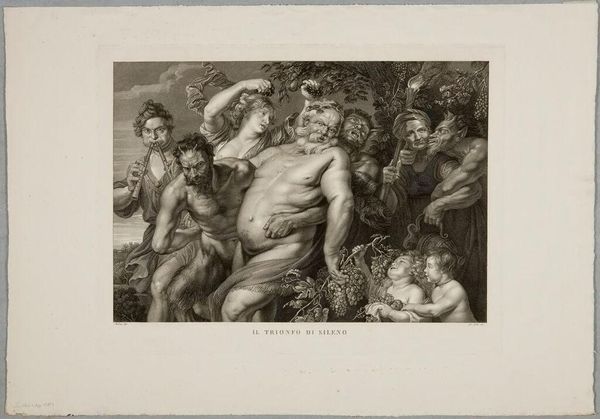 Curator: This print, "The Triumph of Silenus" by Nicolas Delaunay, presents a boisterous scene. The dimensions are approximately 34.6 by 46 centimeters. Editor: My initial thought is chaos! It feels like a bacchanal, all this flesh and revelry spilling out of the frame. Curator: Absolutely, the engraving technique allows for a remarkable density of detail, look at how the artist depicted the textures of skin, fabric, and the abundant grapes. The socio-economic context certainly influenced this style of printmaking at the time. Editor: I am drawn to the figure of Silenus himself, the drunken tutor of Dionysus, surrounded by his devotees. The grapes, the flushed faces – they're all potent symbols of indulgence and the abandonment of reason. Curator: It is fascinating to see how the labor-intensive process of engraving makes this accessible to a wider consumer base. Editor: Indeed, and Delaunay captures a timeless narrative of intoxication and its discontents, inviting contemplation about human nature, even today. Curator: Considering materiality, it is interesting to think about the role that paper plays in popularizing narratives such as these. Editor: A valuable point! Thank you, Curator. Curator: And thank you, Editor.