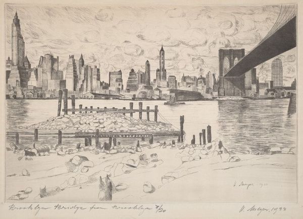 Helen Green Blumenschein made this print, "Lower New York from Brooklyn Bridge," in 1932 using a labor-intensive process: etching. The image is built from countless tiny marks incised into a metal plate. The artist would have painstakingly drawn the scene with a sharp needle, exposing the metal, before bathing it in acid, which bites into the lines. This plate would then be inked and pressed onto paper, transferring the image. The stark contrast and dense hatching give a real sense of the city's grimy, energetic atmosphere. The choice of etching seems particularly fitting. Like the bridge itself, etching is a technology of connection, a way of translating a vision into a reproducible form. The bridge, of course, enabled the expansion of New York, the intensification of its industry. In this print, Blumenschein captured the essence of a city built on labor and innovation, a monument to human ingenuity. It asks us to reconsider the role of 'minor' media such as printmaking in shaping our understanding of major cultural landmarks.