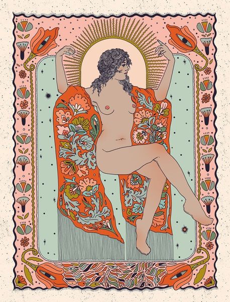 This contemporary piece presents us with a figure adorned in intimate apparel, set against an ornate circular backdrop reminiscent of a mandala. The mandala, an ancient symbol originating in Hinduism and Buddhism, represents the cosmos and the cyclical nature of existence. Here, it echoes the symbolic weight once seen in classical and renaissance artworks depicting divine halos, where auras were used to suggest transcendental insight. The concentric circles and geometric patterns reflect an underlying order, akin to the structure we project onto the universe and the self. Notice how the figure, positioned at the mandala’s centre, becomes the focal point, drawing the viewer into a personal, almost meditative space. This echoes the ‘Pathosformel’, the expression of emotions through gestures. The turn of her head, the soft curls of her hair, and the intimate garb all point to a complex inner life. This motif, rooted in antiquity, resurfaces here, charged with new meaning in a contemporary light.