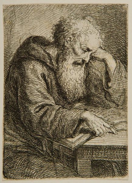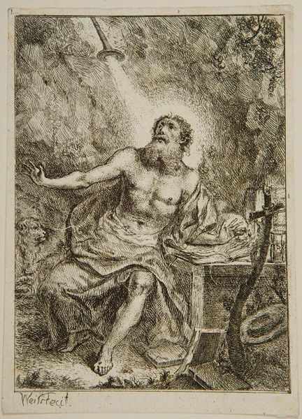 Editor: This is Cornelis Galle the Younger's "Saint Hieronymus." It's an engraving, and I'm struck by the somber mood. What do you see in this piece, beyond just the saint in contemplation? Curator: I see a constructed identity, really. Consider the historical context: Hieronymus was a scholar, yes, but also a figure used by the Church to enforce its power. The setting, the skull, the crucifix – these are symbols deployed to reinforce a narrative of penance and authority. Editor: So, it's not just a portrait, but a statement? Curator: Precisely. It's about controlling the narrative, using Hieronymus to legitimize a specific ideology. The power of images to shape understanding is immense. Editor: I hadn’t thought of it that way. It gives me a lot to consider.