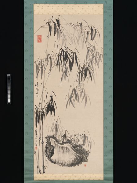 Editor: This is “Bamboo in the Wind,” painted by Taihō Shōkon sometime between 1691 and 1774, using ink on paper. The way the leaves are scattered about—it feels like I'm looking at a fleeting moment, almost a sigh on paper. What do you see in this piece? Curator: Ah, yes, a sigh captured! I love that. It’s a simple scene, right? Just bamboo swaying. But for me, it's a powerful reflection on resilience and adaptability. Notice how Shōkon uses such varying shades of ink – some parts are bold, definitive, others are almost whisper-thin. Like life, isn't it? Strong and fragile all at once. Does the calligraphic inscription mean anything to you? Editor: I hadn't really considered that! Is it directly related to the visual elements? Curator: Perhaps, or perhaps it is separate? In Japanese art, text can serve as both content and design, sometimes giving the artwork a more reflective depth and perspective than the eye may initially gather. Now, when you look at this work, does it make you feel that anything is missing, or lacking? Editor: Hmm... missing? Not exactly. Maybe it's the… simplicity. It’s so minimal; I'm used to seeing artworks that are much more visually loud, dense. It kind of encourages you to add the missing colors in yourself. Curator: Precisely! The "emptiness" in the art encourages engagement, and evokes the surrounding presence of wind itself. And you touch on something so vital here – negative space is such an important aspect of traditional ink paintings from East Asia, to make things meaningful without needing to be physically present. Tell me now, are your impressions of the bamboo the same as they were? Editor: Definitely! I see now that there’s more depth and reflection happening than I originally gave it credit for. It's no longer just about the plant; it’s the space around it, the implied movement, the resilience. Curator: Beautifully put. It's about finding meaning not just in what is depicted, but what is suggested. It's all so incredibly mindful!