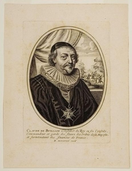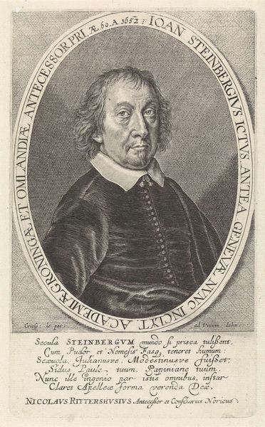 Curator: Let's take a look at this intriguing print, "Portret van Cornelis van Stavenisse op 53-jarige leeftijd," dating roughly between 1649 and 1679, attributed to Hendrick Danckerts. Editor: It’s…stark. The limited tonal range of the engraving emphasizes the detail, but also gives it a kind of rigid formality. The sitter looks a bit severe, maybe? Curator: Well, this was likely commissioned, so that formality fits the context. Portraits, especially engravings like this, played a vital role in disseminating images of power and status within 17th-century Dutch society. Consider the pillar and drapery—classic symbols of authority and respectability. Editor: And the etching process itself! The labour involved in creating this portrait; meticulously scratching those lines into the metal plate. You can almost feel the craftsman's hand at work, trying to convey the sitter's importance through careful labor. What materials would have been used? Curator: We are probably talking about a copper plate and then different types of etching tools to accomplish the various textures visible within the engraving. It also emphasizes the significance of printed images for a broader, literate audience to transmit cultural capital at the time. Think about it - this wasn't just about likeness, but communicating something specific about Stavenisse’s social standing. He clearly wanted to be remembered in a certain light. Editor: Absolutely, I wonder about access. A print like this implies circulation, reproduction – a multiplication of Stavenisse. Is he trying to become more... omnipresent, exerting influence through reproduced image? How many copies were produced, and who consumed them? What type of paper was used and from which workshop? Those details, often overlooked, shape the work's significance and power. Curator: These are important questions! Also to think about: how did people at the time receive the artwork? We read it in the twenty-first century as an antiquated representation but to people at the time, was the picture ‘speaking’ to them effectively? Editor: Considering those prints circulated as commodities within the cultural landscape. Looking closely at the engraved lines forming the details of his garments, how the fabric is depicted—there is so much material culture encoded here. Curator: Exactly. We are always dealing with multiple layers of meaning and context when approaching artworks. The more we analyze and historicize them, the better we can understand the intention but also the effect. Editor: Agreed. It all pushes us to ask, who were the makers and users, how was labor involved, and what meanings accrued through circulation and use.