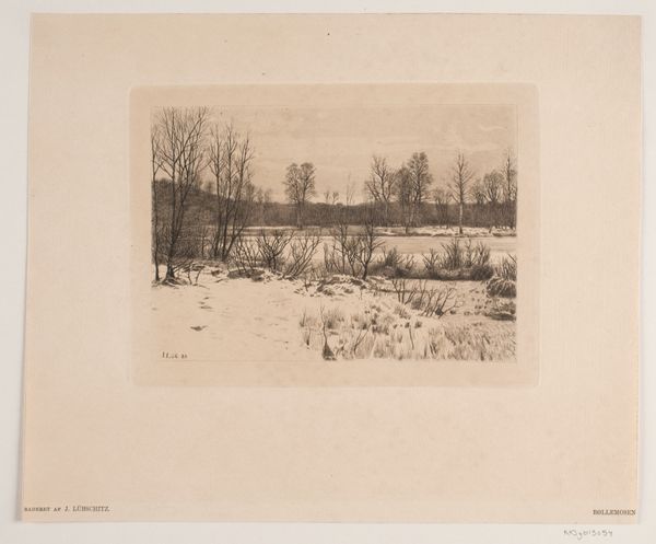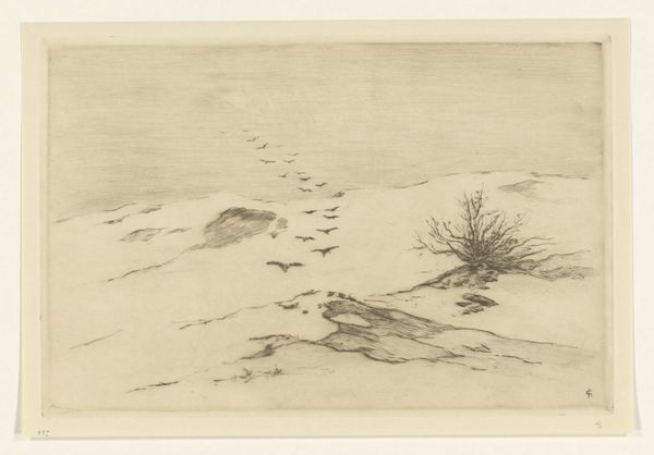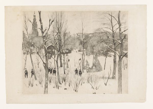 Willem Witsen made this etching of a snowy orchard with birds. Printmaking is a fascinating process, where the artist doesn't directly create the image you see. Witsen would have used sharp tools to incise lines into a metal plate, building up the composition bit by bit. The plate is then inked, and the ink trapped in those lines is transferred to paper under immense pressure. Here, the stark contrast of the black ink against the white paper creates the feeling of a cold, still winter day. Notice how the bare branches of the trees are rendered with fine lines, while the snow-covered ground is suggested with a more textured approach. This isn’t just a picture; it’s a record of skilled labor, of the artist’s hand carefully working the metal, and of the printing process itself. Thinking about this, we can appreciate how printmaking, as a reproducible medium, democratizes art. It also ties it to the wider world of industrial production. Looking closely at the materials and the making opens up a whole new way of seeing, beyond just the image itself.